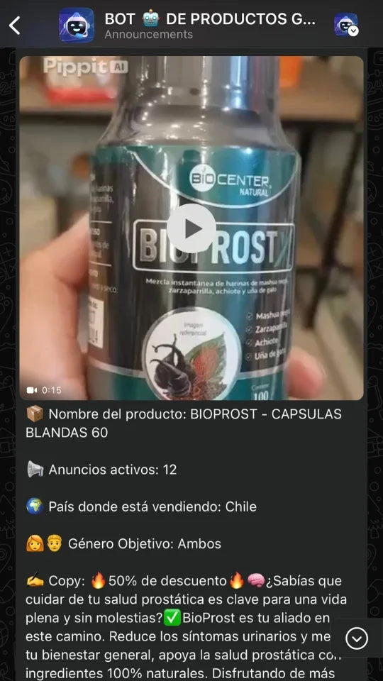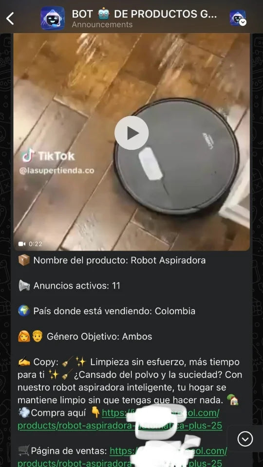 Nuestro Bot se encarga de encontrar los Productos Ganadores y más vendidos de toda LATAM, USA y el mundo. Luego te los manda a tu WhatsApp todos los días listos para que vendas. (Su página, sus anuncios, su copy y demás)